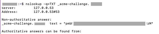 nslookup -q=TXT _acme-challenge.<YOUR DOMAIN>