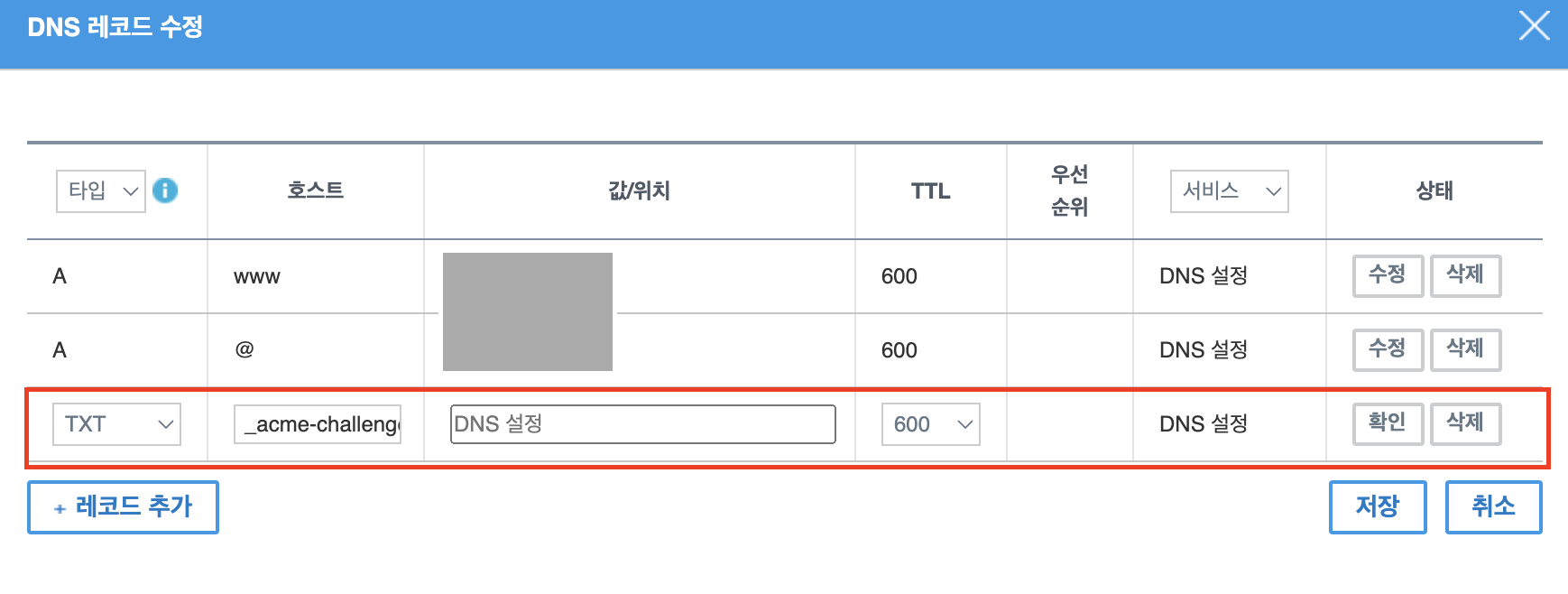 위에서 나온 코드 값을 DNS 설정에서 레코드 추가해준다.
